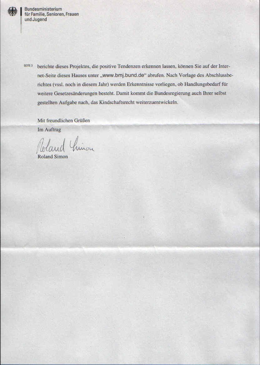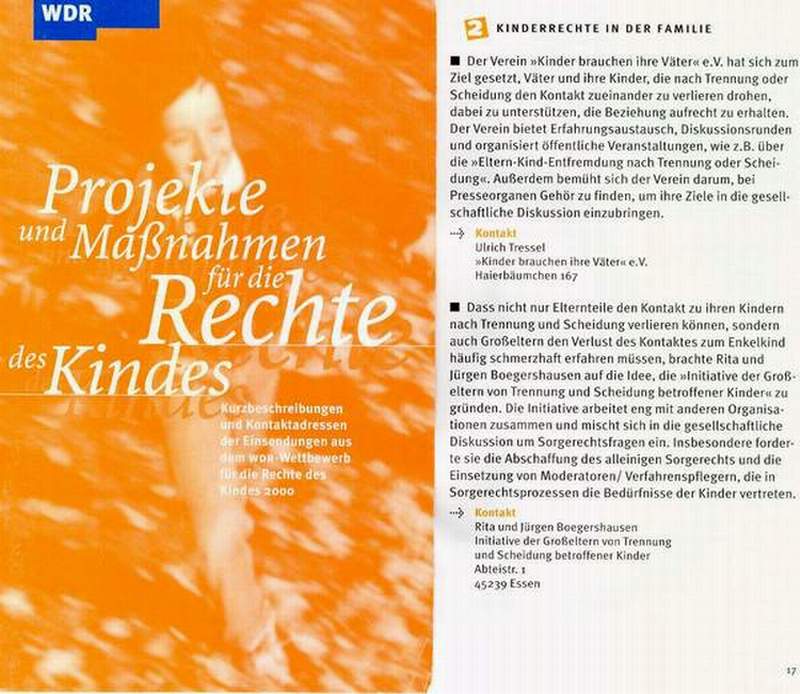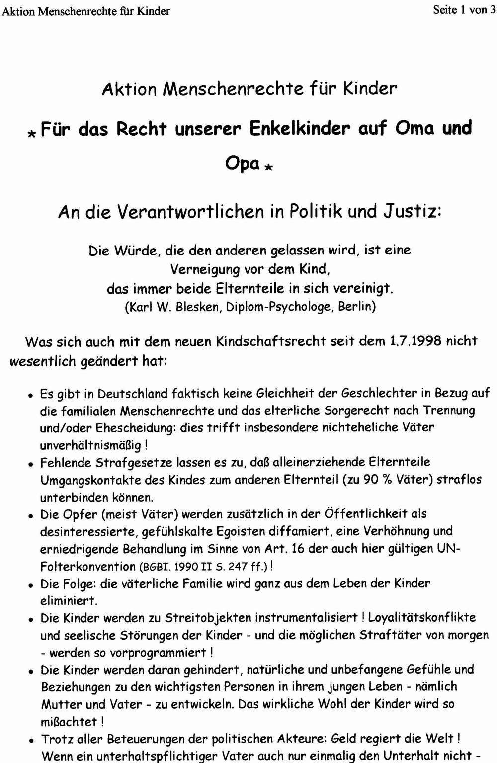 Petition an den Deutschen Bundestag (2.) Unsere 1. Aktion - siehe unten - entsprach leider nicht ganz den förmlichen Voraussetzungen. 16. Januar 2004 Wir haben dabei auch erfahren, dass möglichst viele gleichartige Petitionen von ähnlich Weitere Petitionen nicht mehr erforderlich, Petition an den Deutschen Bundestag - 12., 28. und 30. November 2003 Reaktionen (zum Lesen anklicken) Rundschreiben an alle Ministerpräsidenten der Bundesländer Über Email haben wir jetzt direkt alle Büros der Ministerpräsidenten angeschrieben und Als einen möglichen Lösungs- bzw. Verbesserungsansatz haben wir dabei das sog. 26. November 2003 Reaktionen (zum Lesen anklicken) Wir meinen: Gesetzesinitative zu § 1685 BGB notwendig! Wir haben schon häufig über das Problem berichtet: Für ihre Enkelkinder Umgangsrecht Hiermit sind auch gerade Grosseltern aus den verschiedensten Gründen überfordert. Eine entsprechende Initiative haben wir jetzt wieder unternommen: Per Email wurden 11. November 2003 Reaktionen (zum Lesen anklicken) Einladung zum 2. Familienkongress des Väteraufbruch für Kinder e. V. Die o. a. Initiative hat uns gebeten, auf eine hochkarätig besetzte Veranstaltung Dem kommen wir gerne nach, da uns die Referenten bekannt sind und das geplante
