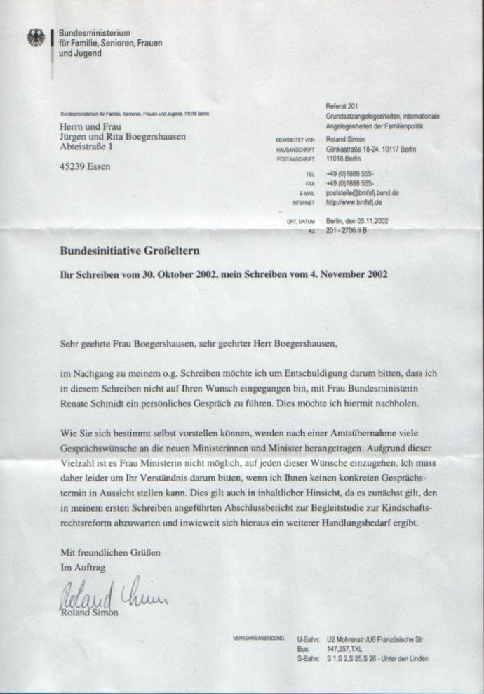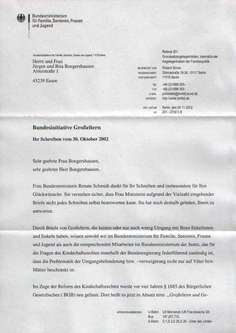 per E-Mail 30. Oktober 2002 Brief an Familienministerin Renate Schmitt