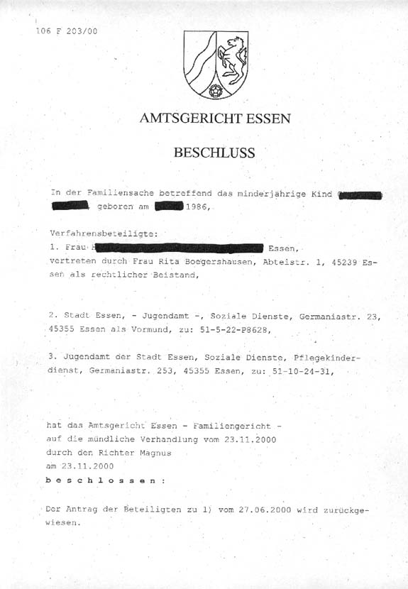 23.11.2000 Amtsgericht Essen 5 Seiten | Download aller 5 Seiten als ZIP-Datei Zum Lesen auf die jeweiligen Seiten klicken 02.07.2001 Amtsgericht Witten 6 Seiten | Download aller 6 Seiten als ZIP-Datei Zum Lesen auf die jeweiligen Seiten klicken |